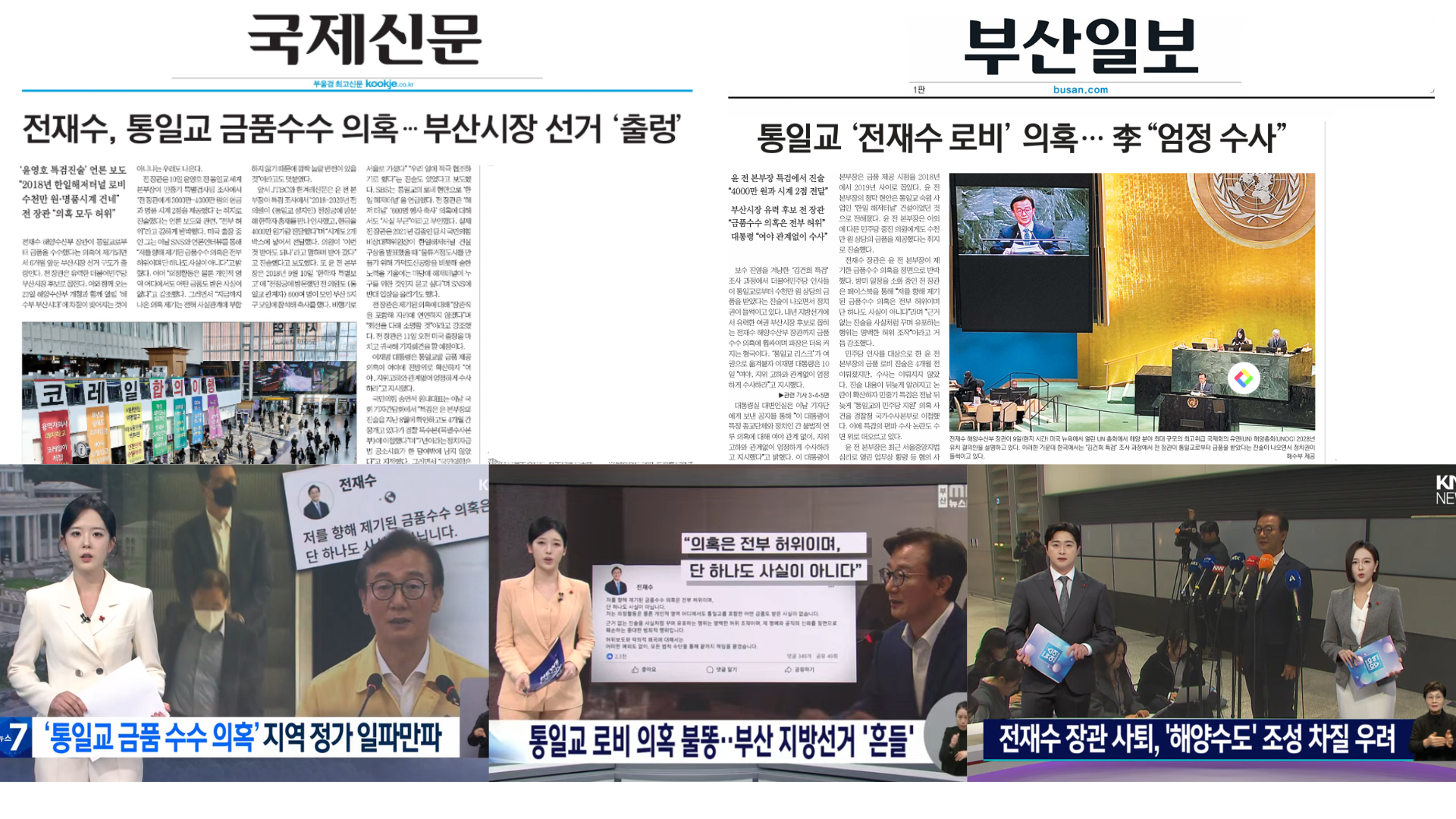 3) <전재수, 금품 수수 부인…지역사회 ‘술렁’>(KBS부산, 12/10), <통일교 로비 의혹 불똥..내년 부산선거 ′흔들′>(부산MBC, 12/10), <전재수 장관 사퇴, 지역 현안 차질 우려>(KNN, 12/10)