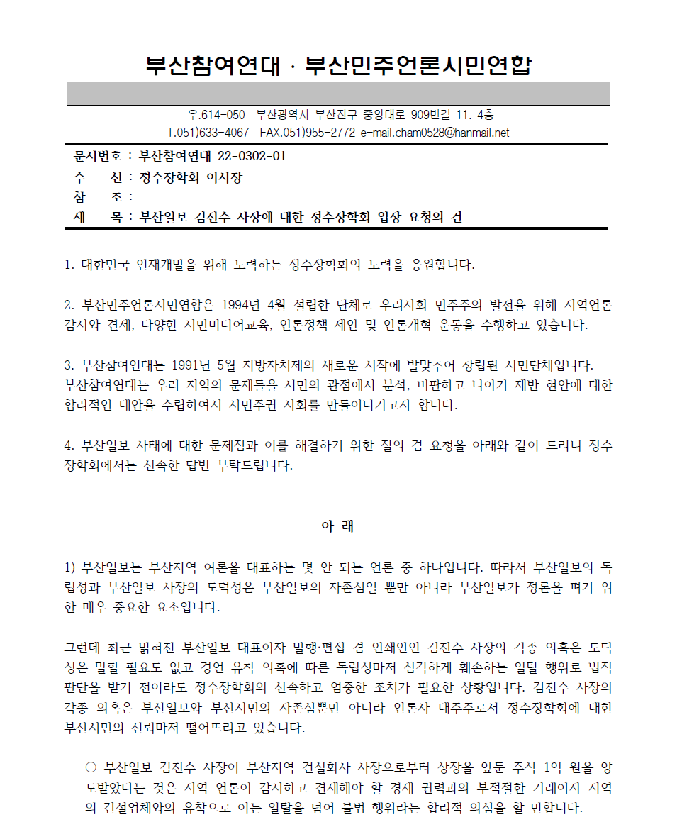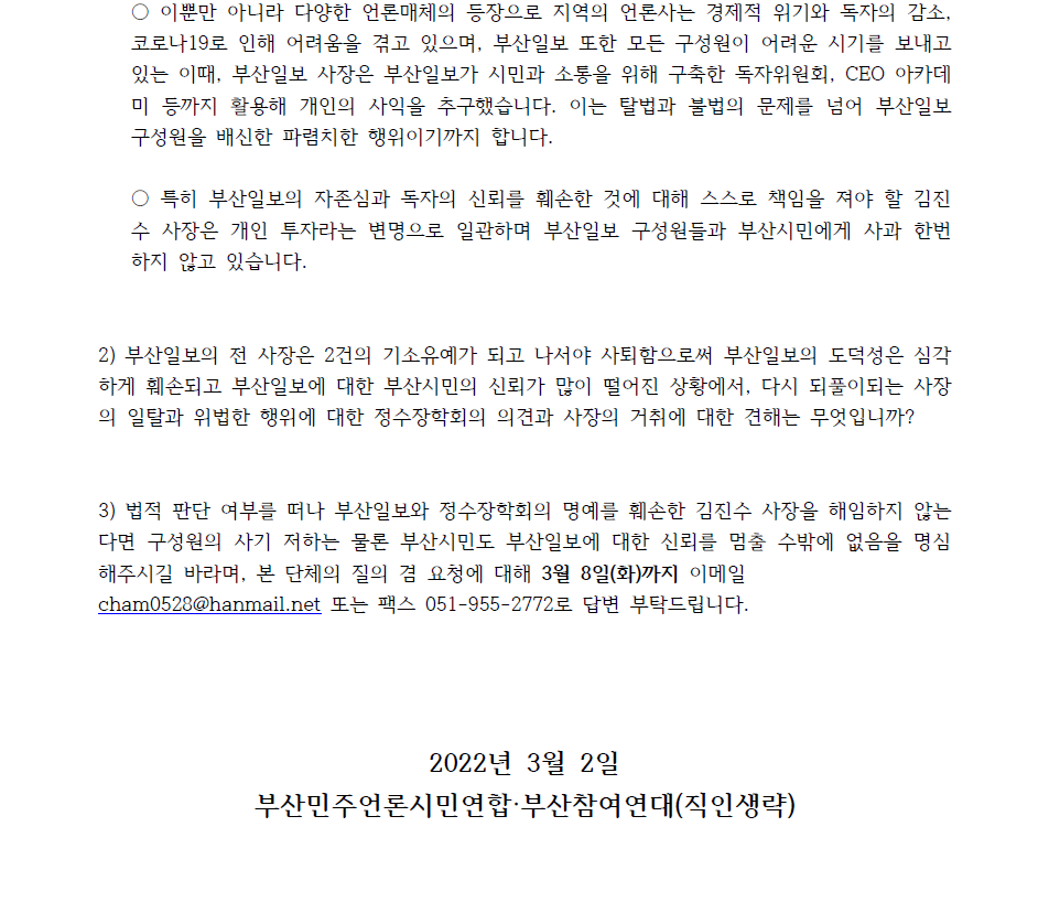 부산지역 주요 일간지 중 하나인 부산일보 대표이사이자 발행·편집 겸 인쇄인인 김진수 사장의 기업과의 유착 의혹, 독자위원회와 CEO 아카데미 등까지 활용해 개인의 사익을 추구한 의혹에 대한 문제제기가 있은 지 170일이 경과하고 있다.