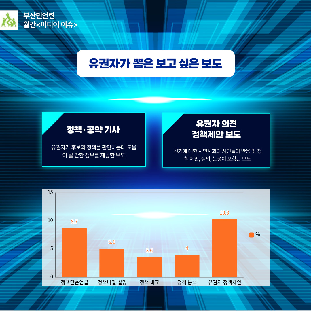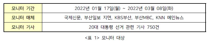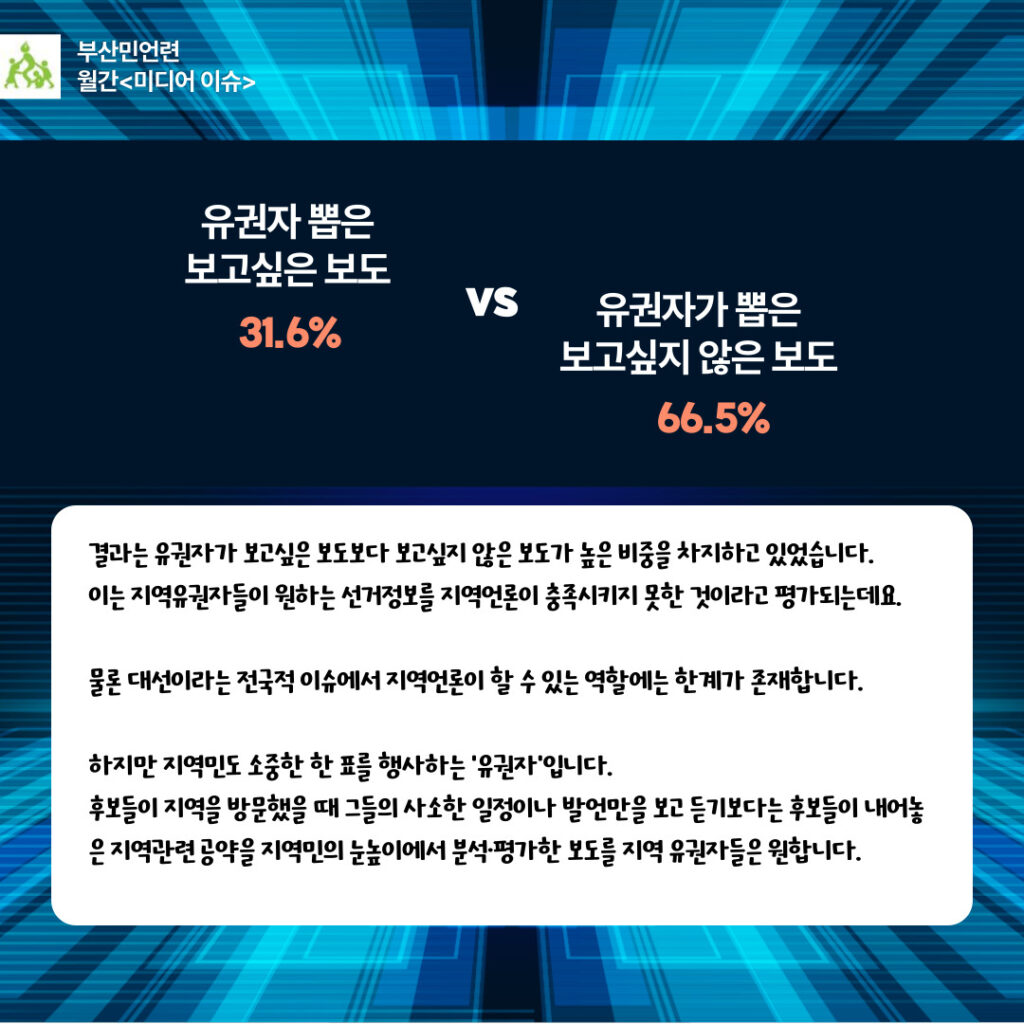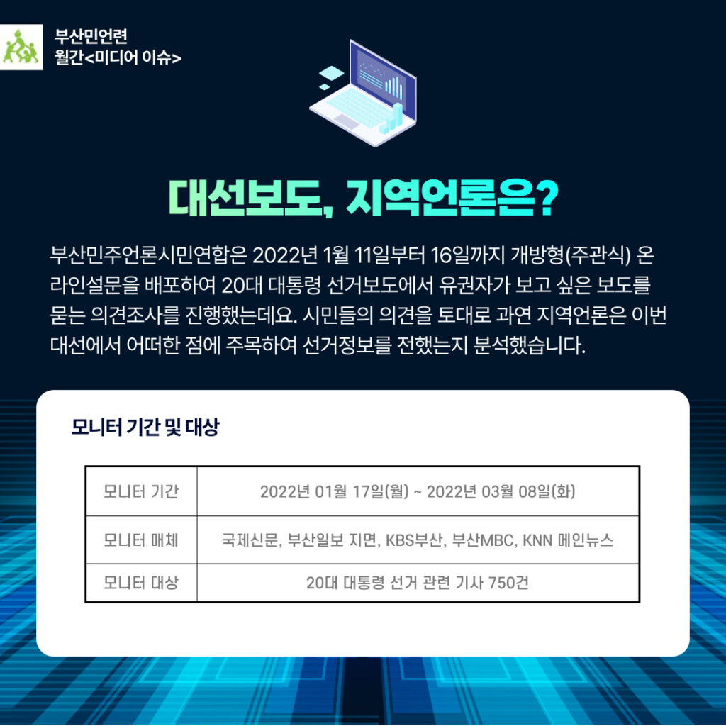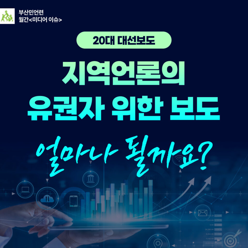 부산민주언론시민연합은 2022년 1월 11일부터 16일까지 개방형(주관식) 온라인설문을 배포하여 20대 대통령 선거보도에서 유권자가 보고 싶은 보도를 묻는 의견조사를 진행하였다. 시민들의 의견을 토대로 과연 지역언론은 이번 대선에서 어떠한 점에 주목하여 선거정보를 전했는지 분석했다.