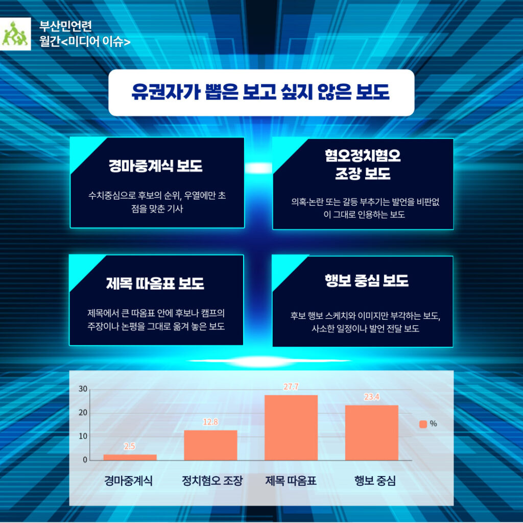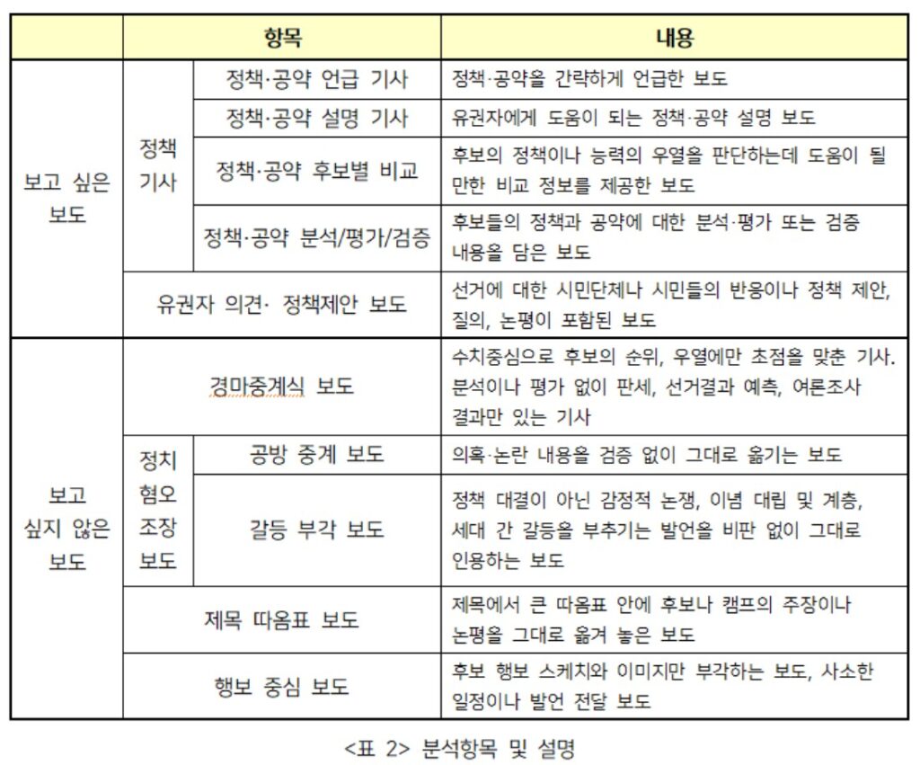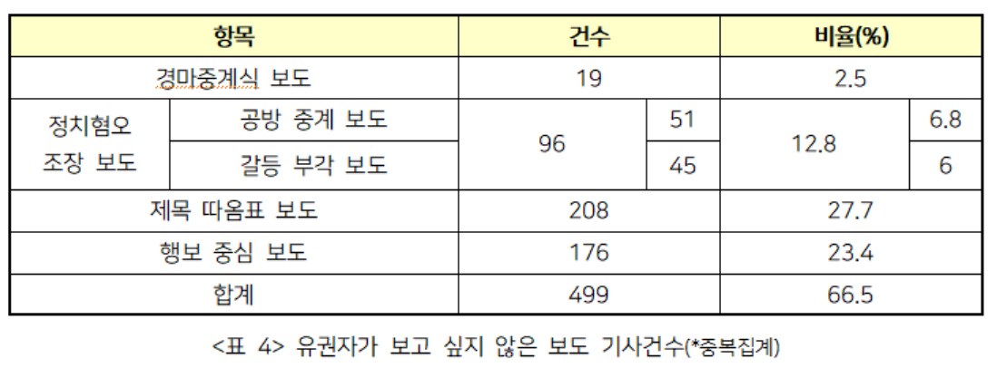 시민들이 선거시기에 유용하지 않다고 생각한 뉴스는 평가나 분석 없이 수치상으로만 후보의 순위와 우열을 나열하는 경마중계식 보도, 정치권의 갈등과 막말 등을 중계하는 정치혐오를 부추기는 보도, 제목에 편견을 부추기는 발언 정치인의 발언을 그대로 옮기는 ‘따옴표 보도’ 그리고 특별한 정보값 없이 후보의 이미지만 부각시키는 행보 중심보도 등을 꼽았었다.