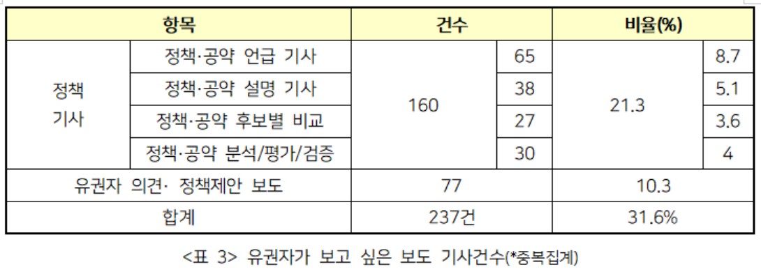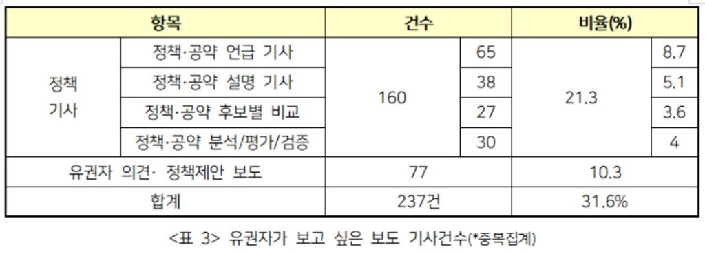 시민들의 민주적 정치 참여를 유도하는 유권자 의견 및 정책 제안과 관련된 기사는 77건으로 전체 선거보도의 10.3%를 차지했다. 이 중 방송뉴스는 18건으로 리포팅 보도는 7건, 단신으로 전한 보도는 11건으로 더 많았다. 유권자 의견이나 정책제안 내용의 신문기사는 59건으로 이중 외부의견(기고, 칼럼 등)이 31건으로 가장 많았다. 스트레이트 기사 19건, 기획기사 7건, 사진기사 2건이었다. 이는 지역언론이 선거시기에 시민사회와 유권자의 의견을 10건 중 1건을 보도했지만 주로 단신이나 외부기고를 통해 전했다는 것을 알 수 있다.