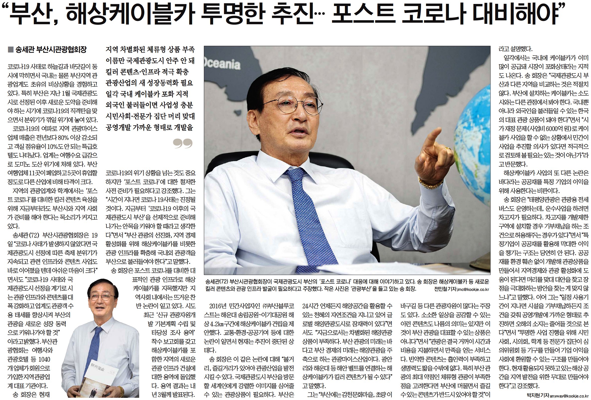 4월 20일 국제신문 <“부산, 해상케이블카 투명한 추진…포스트 코로나 대비해야”> 송세관 부산시관광협회장 인터뷰 + <부산 여행 리폼+로컬푸드 등 특색 있는 관광상품 공모>