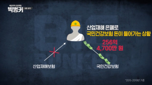 <빅벙커>는 포스코건설 엘시티 추락사고와 현대중공업 하청 노동자 아르곤 가스 질식사 사고 이후를 추적했는데요, 노동자가 사망했는데도 책임을 져야 할 포스코와 현대중공업은 2019년 상반기에만 산재 산재보험료를 각각 94억 원, 10억 원 감면받았음을 밝혔습니다. 하청 기업 산재는 원청의 산업재해에 포함되지 않기 때문에 일어난 일이었습니다. 산재보험료 납부를 기업에게 부담 지우는 것은 이윤을 얻는 만큼 책임을 지라는 취지입니다. 그러나 실상은 이렇게 산업재해가 은폐되고 오히려 노동자가 건강보험으로 치료를 받는 일이 비일비재합니다. <빅벙커>는 산재 사고로 작년에만 건강보험료 256억 4700만 원이 지급됐다고 분석했습니다. 산재를 은폐하기 위해 사고가 나도 유니폼을 벗기고 사복으로 갈아입혀 치료받게 하는 충격적인 상황을 고발하고 제 역할을 하지 못하는 노동부 특별감독과 부산시의 안일한 태도도 지적했습니다. <빅벙커> 패널들은 원청에게 산업재해에 대한 공동책임을 부여하고 처벌을 강화해야 한다고 제안했습니다.