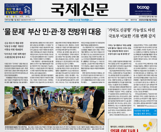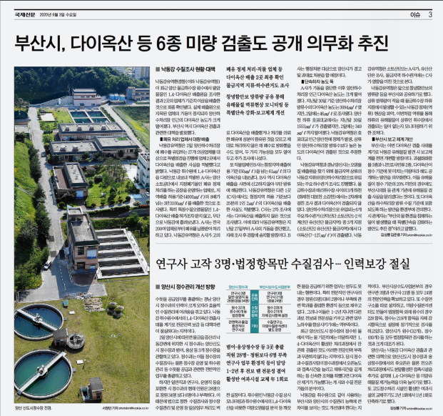 지난 5월 물금취수장 부근 낙동강 물에서 발암물질인 다이옥산이 기준치 160배 농도로 검출되는 사고가 있었습니다. 국제신문은 양산시와 부산시상수도사업본부가 이 사실을 발표한 5월 20일 이후 6월까지 낙동강 물 문제를 꾸준히 추적했습니다. 1면에 올린 횟수가 8번, 1면 머릿기사로 다룬 횟수가 6번에 해당할 만큼 지역 언론 중 가장 적극적이었습니다. 무단 방류한 업체 적발, 당국의 늑장 대응, 물금취수장 근처에서 다이옥산이 검출된 이유, 양산정수장의 유사한 사고를 주요하게 보도했습니다.