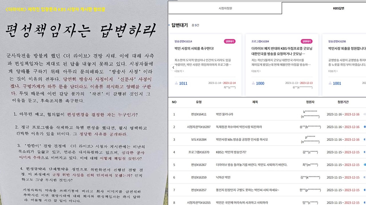 | ? 시청자 안중에도 없는 공영방송 KBS 박민 사장 사퇴요구 잇따라 국민일보 출신 박민 신임 사장 취임 후 공영방송 KBS에서 도저히 납득하기 어려운 시청자 무시, 편성자율권 침해와 규정 위반이 벌어지고 있습니다. 취임한 13일 전후 ‘뉴스9’ 앵커 하차 통보부터 ‘주진우 라이브’ 진행자 교체, ‘더 라이브’ 당일 편성 삭제까지 일사천리 진행되었고, 취임 후 기자회견에서는 재창조 수준의 조직 통폐합을 천명하고, 편파보도 물의에 대해서는 엄정 징계하겠다고 밝혔습니다. 시청자 “페지 반대” “진행자 돌려달라” 성토 잇따라 기자, PD 라디오센터장 등 책임자 사과와 징계 요구 나서 ‘더 라이브’ 제작진 “구멍가게도 하루라도 문 닫으면 양해 구한다” KBS 뉴스 사과 방송에 기자들 분노 폭발… 기자협회 작성자도 없는 ‘4분짜리 사과’ 누굴 위한 것이었나” “나라가 망하고 있는거 같아요” 성토글 이어 ‘더 라이브 폐지 반대합니다’ 시청자 청원에 KBS 답변 의무 생겼다 민주당 “취임하자 KBS 땡윤뉴스 부활이어 일베방송 만드나” 민언련 “KBS 파괴자 박민 물러나야”… “언론노조 대못부터 제거해야” 사퇴 촉구 나섰다 박민 사장의 보도, 제작 자율성 침해에 KBS 기자, PD, 노동조합 등 구성원의 성토가 잇따랐고 시청권을 침해한 사장단에 대한 시청자 비판도 거셉니다. 일방적인 프로그램 폐지에 함께 일하던 프리랜서, 비정규직 노동자들도 피해를 입게 되었습니다. 이 모든 혼란과 파행을 불러온 박민 사장에게 공영방송을 이끌어 갈 자격이 있는지 묻지 않을 수 없습니다. ? 22대 총선 선거방송심의위원회 공정성이 위험하다 3인 합의제 무시하고, 류희림 위원장과 국힘 추천 위원으로 일방 결정 심의대상인 TV조선이 추천한 선거방송심의위원 공정한 심의 가능할까 류희림 위원장 박사논문 지도교수도 선거방송심의위원 위촉 11월 13일 방송통신심의위원회는 내년 4월 총선 방송을 심의할 선거방송심의위원회 구성을 의결했습니다. 의결 전부터 위원 추천단체 지정에 대한 우려가 있었는데요, 학계추천을 대표적인 언론학회나 방송학회가 아닌 신생 학회에 맡기는가 하면 심의대상이 될 수 있는 TV조선에 추천권을 주고 보수미디어단체가 추천단체가 되기도 해 대표성과 공정성에 논란이 있었습니다. 우려대로 이들 단체가 추천한 선거방송심의위위들은 TV조선 출신 인사, 노조활동 부당개입한 전 MBC 부사장, 류희림 방송통신심의위원장의 박사논문 지도교수 등등 부적절하다는 비판이 나오고 있습니다. 더구나 선거방송심의위원 선정을 여야 합의로 해야한다는 취지를 깨고 류희림위원장과 국힘 추천 위원이 결정해 일방적이라는 지적도 나왔습니다. ![]() [관련 기사와 논평] <TV조선 추천 위원이 심의하는 선거방송심의위원회>(미디어오늘, 11/13) <방심위원장 ‘박사논문 지도교수’, 선거방송심의위원 위촉>(미디어스, 11/15) <방통위와 방심위의 노골적인 선거개입, 이동관을 탄핵하라.>(전국언론노조, 11/14) ? 방송3법 수용 및 이동관 탄핵 대국민 서명 운동 진행 시민사회단체, 전국언론노조 등은 이동관 방송통신위원장 탄핵 운동에 본격 나섰습니다. 먼저 전국민주언론시민연합네트워크가 11월 15일 전국 주요 도심에서 언론장악과 언론탄압을 주도하고 있는 이동관 방송통신위원장 탄핵을 촉구하고, 국회를 통과한 방송3법 개정안에 대한 윤석열 대통령의 즉각 수용을 촉구하는 1인시위를 동시다발로 벌였고, 전국언론노동조합은 국회앞에서 농성을 시작했습니다. 이동관 탄핵 촉구 100서명운동에 적극적인 참여와 널리 공유 부탁드립니다. ➡️“방송법 수용! 이동관 탄핵!” 언론탄압 저지를 위한 백만인 서명하기 ![]() https://www.youtube.com/embed/UmdyLOXeiO4 [관련 기사와 성명] <이동관 방통위원장 탄핵, 반대 보다 찬성 여론 높았다>(미디어오늘, 11/14) <언론노조 “이동관 탄핵까지 국회 앞 끝장 농성” 돌입>(미디어오늘, 11/15) <언론장악, 언론탄압으로 민주주의 퇴행 불러온 이동관 탄핵하라.>(전국민언련네트워크, 11/15) ? 이 주의 ‘언론장악’ 단신 늬우스 ? 반발 분노 폭발한 방심위 직원 150명 “방심위 주인은 직원, 위원장 사과하라” 가짜뉴스 대응을 이유로 방송통신심의위원회가 ‘가짜뉴스 신속심의센터’를 열고 인터넷 뉴스 심의 등 규정에도 없는 무리한 심의를 강행한다는 논란이 어어지는 가운데, 방송통신심의의원회 직원들의 집단 반발이 일어났습니다. 방통심의위 평직원 150명 일동은 가짜뉴스 신속심의센터의 역활과 기능에 대한 충분한 논의가 필요하다며, 사회적 합의가 이뤄질때까지 직원들의 센터 인사발령을 반대한다는 서명부를 제출했습니다. 가짜뉴스 규제의 법적 근거가 없다는 외부 비판과 더불어 내부 반발까지 날로 거세지는 가운데 방통심의위가 가짜뉴스 규제를 지속할 수 있을지 여부가 주목됩니다. <방심위 ‘인터넷 언론’ 심의, 위헌 우려 크다>(민언련 특별칼럼, 10/17) <분노 폭발한 방심위 직원 150명 “방심위 주인은 직원, 위원장 사과하라”>(미디어오늘, 11/14) ? 홍준표 대구시장 대구MBC 기자고소… 제왕적 시장 반발 홍준표 대구시장이 편파방송으로 TK신공항 