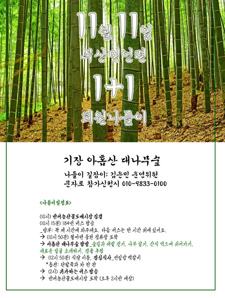 공지사항 부산민언련 1111 회원나들이 2018-10-31 bssiminnet Leave a comment <부산민언련 1+1 회원나들이 > 청명한 가을을 맞아 반가운 얼굴들과 함께 숲 산책을 하려합니다. 부산민언련이 11월 11일 기장 아홉산 대나무숲으로 회원나들이 갑니다. 김은민 운영위원의 안내로 대나무숲의 아름다움과 늦가을 정취를 함께 느껴보아요. 1+1컨셉입니다. 새로운 내 친구를 민언련에 소개해주세요. 자세한 사항은 아래 웹자보 참고하세요. *회비는 개인 식사비 15,000원 내외, 입장료는 민언련이 쏩니다.