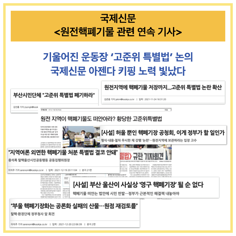 국제신문의 <원전핵폐기물·고준위 방사성 폐기물 관리에 관한 특별법 관련 연속 기사>는 지역의 주요 현안인 ‘고준위 방사성폐기물 처리에 관한 특별법’에 대한 지속적인 관심을 여러 분야의 기사로 보여줌으로써 지역사회는 물론이고 지역의 문제 제기가 전국적으로 확산되는데 기여했습니다.