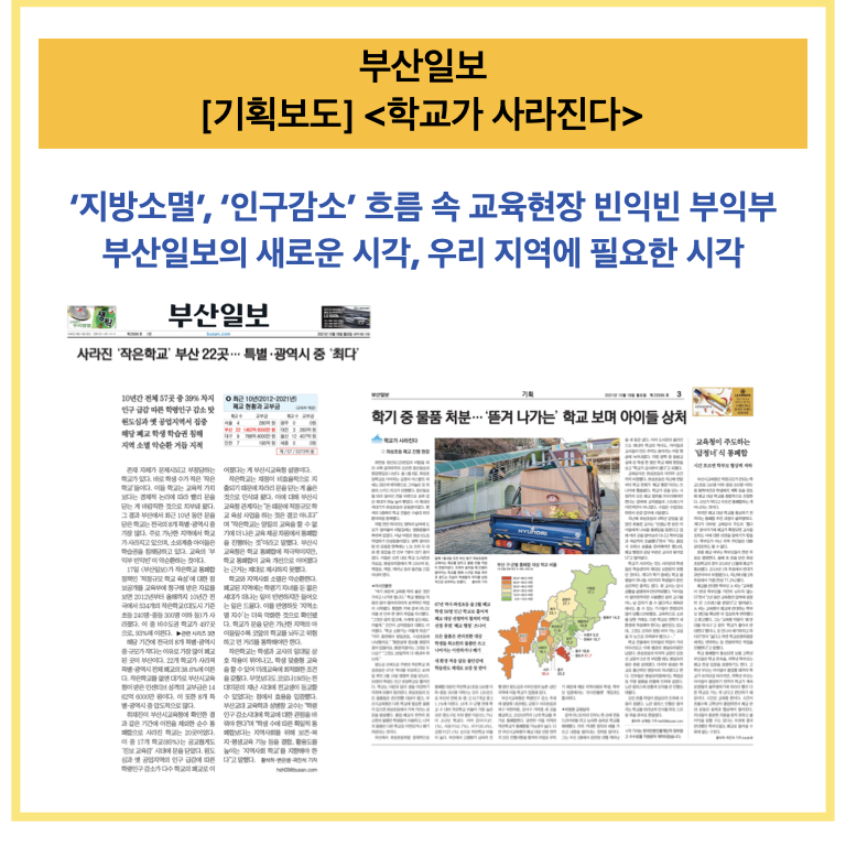 부산일보 기획보도 <학교가 사라진다>는 통폐합·폐교의 대상이 되고 있는 작은 학교 문제를 수면 위로 올렸습니다. 교육현장의 모습을 빈익빈 부익부 측면에서 조명해, 소외지역 아이들의 학습권 침해 문제를 구체적 사례로 드러내기도 했습니다.