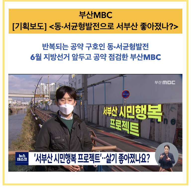 부산MBC 기획보도 <부산 동·서 균형발전의 허울>은 6월 지방선거를 앞두고 선거철마다 반복해 등장하는 공약인 동·서 균형발전사업의 10년을 돌아봐 시의적절 했고, 서부산 개발의 현주소를 적나라하게 드러내 예산 투입 실효성 문제에 대한 공감대를 높였습니다.