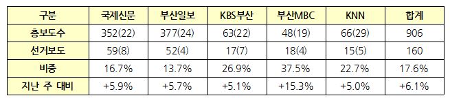 3월 29일(D-9)부터 4월 4일(D-3)까지 부산 지역언론 선거보도는 160건으로 총보도 906건 중 17.6%를 차지했다. 지난 주 선거보도 107건, 보도비중 11.5%에 비해 비중이 6.1%p 증가했고, 전체 모니터 기간 중 가장 많은 보도 건수와 비중이다.