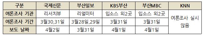 4월 1일부터 여론조사결과 공표가 금지됨에 따라, 지역언론은 마지막 여론조사 결과를 냈다. 관련 기사로는 KBS부산과 부산MBC는 각 1건, 국제신문과 부산일보는 각 8건이었다.