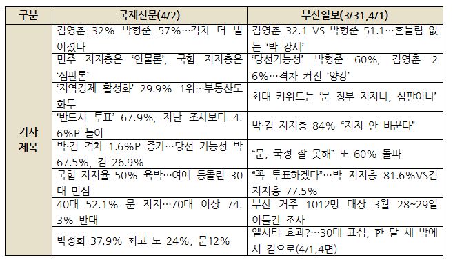 △ <표 4> 국제신문, 부산일보 여론조사 결과 보도 기사제목 목록