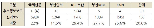 전체 선거보도 160건 중 33건, 20.6%가 후보행보 보도였다. KBS부산 비중이 가장 높았고 신문보다는 소위 ‘그림’을 좇는 방송에서 후보의 행보를 담은 동정보도 비중이 높았다.