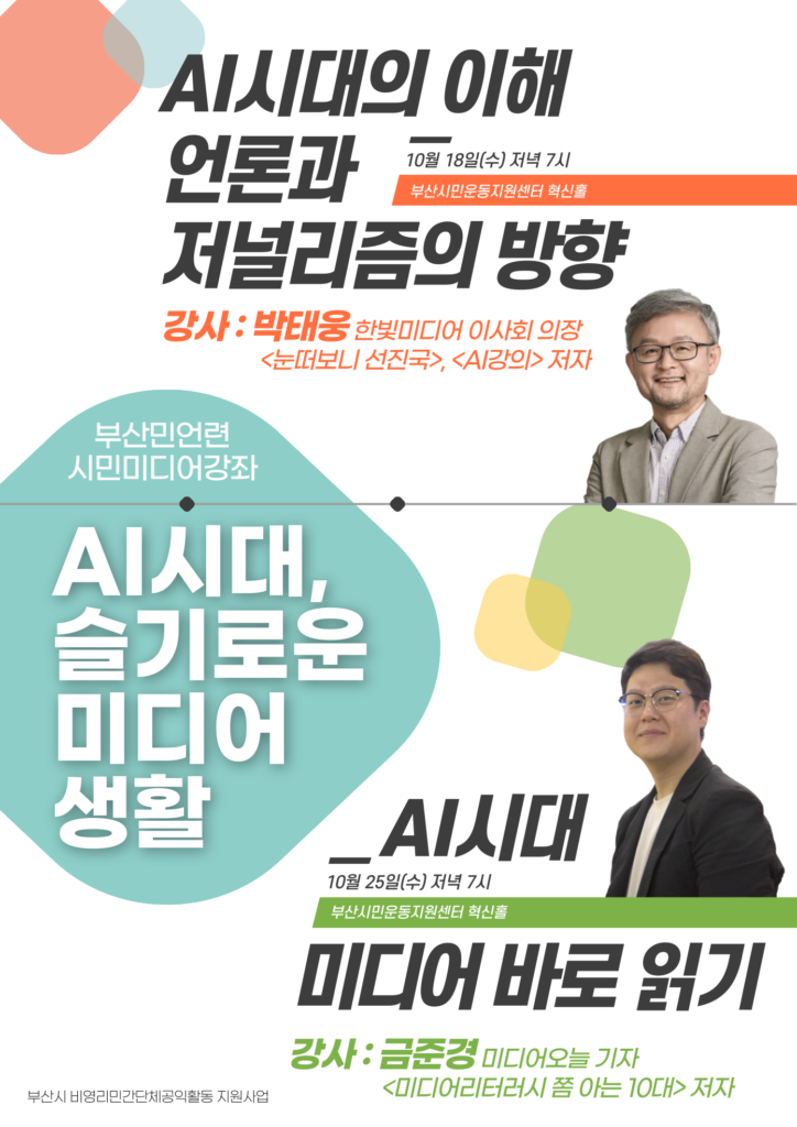 이에 부산민언련은 시민미디어강좌- ‘AI시대, 슬기로운 미디어생활’을 열어 AI에 대한 이해와  언론, 저널리즘에 미칠 영향을 살펴보고 또 AI 리터러시는 어떻게 해야하는지에 대해 알아봅니다.