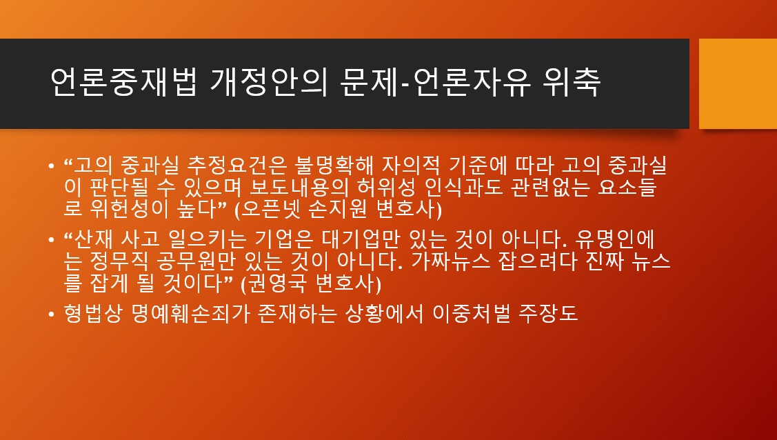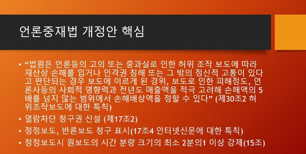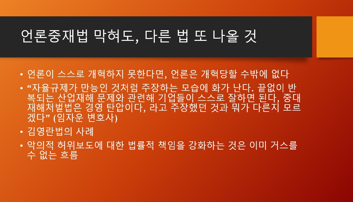 그리고 악의적 허위보도에 대한 언론의 책임, 법률적 책임을 강화하는 것은 거스를 수 없는 흐름이며, 언론이 스스로 혁신하지 못한다면 언론은 개혁당할 수 밖에 없다고 마무리지었습니다.