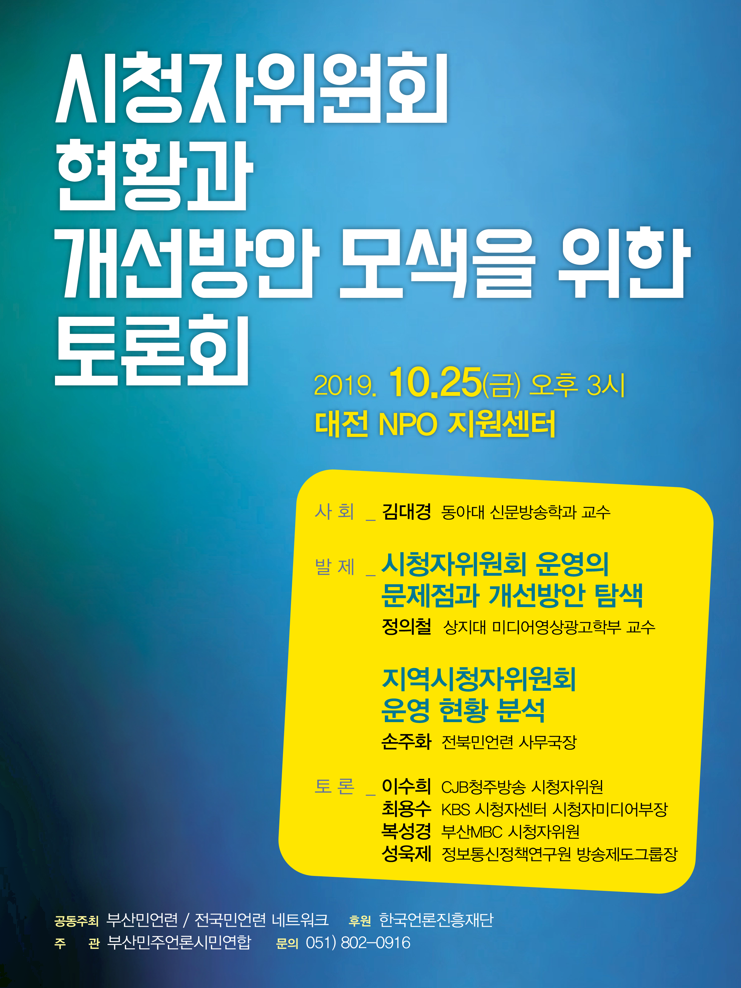 공지사항 시청자위원회 현황과 개선방안 모색 토론회 개최 2019-10-15 bssiminnet Leave a comment 각 방송사의 시청자위원회는 시청자가 직접 참여하여 의견을 전하고 권익을 대변하는 대표적인 기구입니다. 위원회에는 각계의 시청자가 참여하도록 법은 규정하고 있는데요 실제 운영은 그렇지 못해왔습니다. 부산민언련과 지역 민언련에서 지난 3년간 서울, 대전, 충북, 전북, 경남, 부산 지역 방송사들의 시청자위원회 운영 실태를 조사했고, 이를 토대로 개선방안을 찾기 위한 토론회를 엽니다. 토론회 이후에는 부산 지역 보고서도 공개할 예정입니다.
