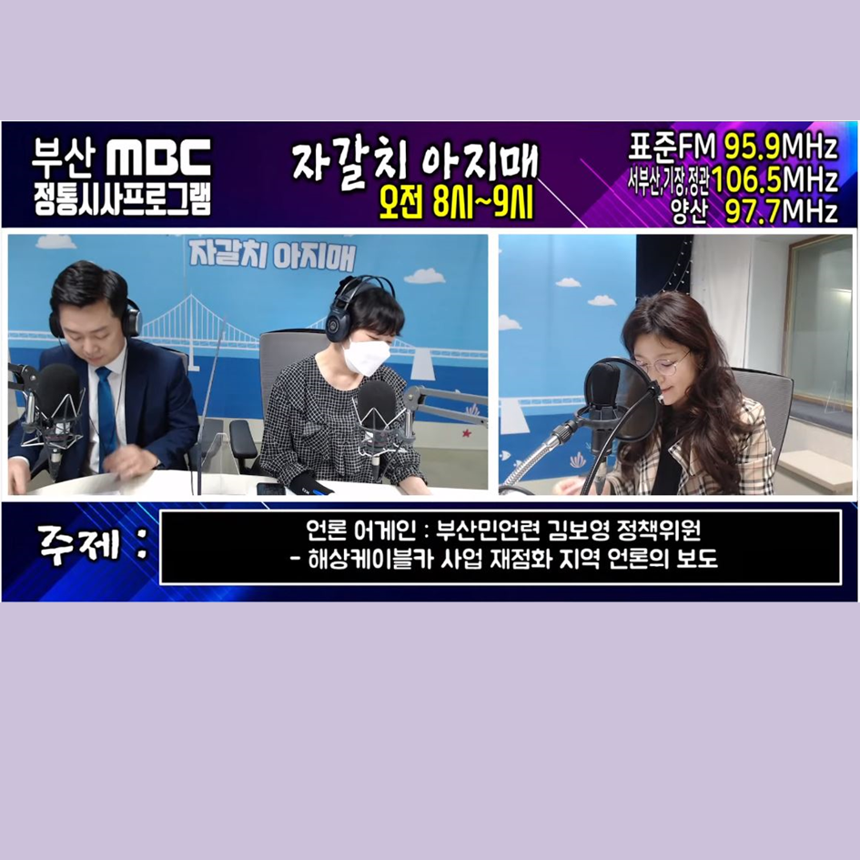 미분류, 활동소식 [언론어게인] 부산MBC 라디오 자갈치아지매(5/14) 2021-05-21 bssiminnet Leave a comment 2021년 5월 14일, 부산MBC 라디오 <자갈치아지매_언론어게인> 원고 받기>> 부산mbc라디오 자갈치 아지매 원고_0514 방송 내용>> 해상케이블카 사업 재점화한 지역언론 보도 문재인 정부 4년 평가, 지역 균형 입장에서 짚어 본 국제신문 부족한 산재보도, 유족의 목소리 주목한 부산MBC