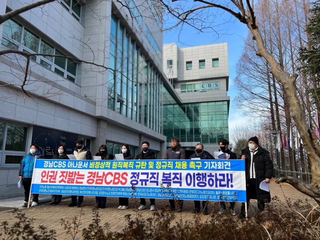 지난 11월부터 제기된 경남CBS 최태경 아나운서의 부당한 ‘원직복직’에 맞서는 활동에 부산민언련도 작은 힘이지만 힘을 보태고 있는데요. 12월 26일, 부산경남지역 시민사회와 함께 하는 기자회견에 부산민언련도 함께 했습니다.
