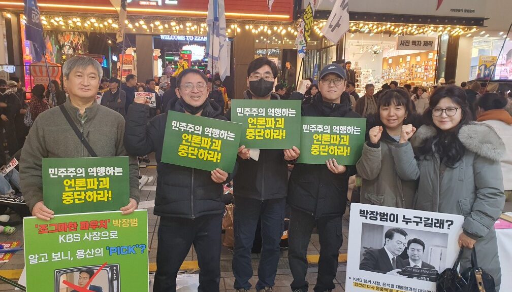 부산민언련 회원들은 부산시민들에게 박장범 사장 임명 문제를 알리기 위해 ‘KBS사장 박장범 OUT’ 피켓 선전을 진행한 것인데요. 공영방송의 정치적 독립성을 훼손하고 마구잡이로 언론장악을 진행하고 있는 윤 대통령에 대해 시민들과 함께 분노의 목소리를 모았습니다.