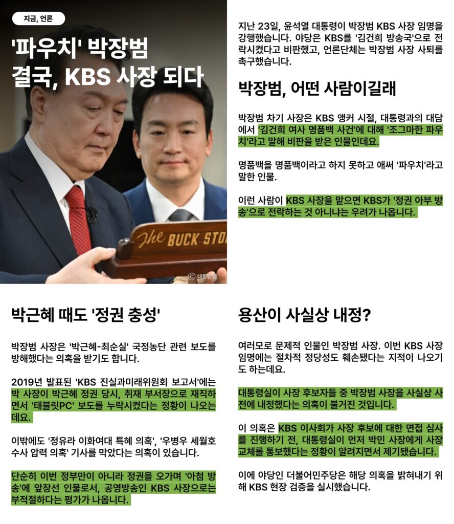 윤석열 대통령이 임명한 KBS 박장범 사장은 앵커 시절, 대통령과의 대담에서 ‘김건희 여사 명풍백’을 ‘조그마한 파우치라’고 부르며 KBS를 조롱거리고 만든 부적절한 인사입니다. 그런데 박장범을 사실상 용산이 내정한 의혹마저 있습니다. KBS 사장 추천이 되기도 전에 대통령실이 먼저 사장 교체 통보를 한건데요, 공영방송 KBS의 독립성을 훼손하는 중대한 문제입니다.