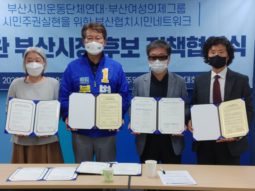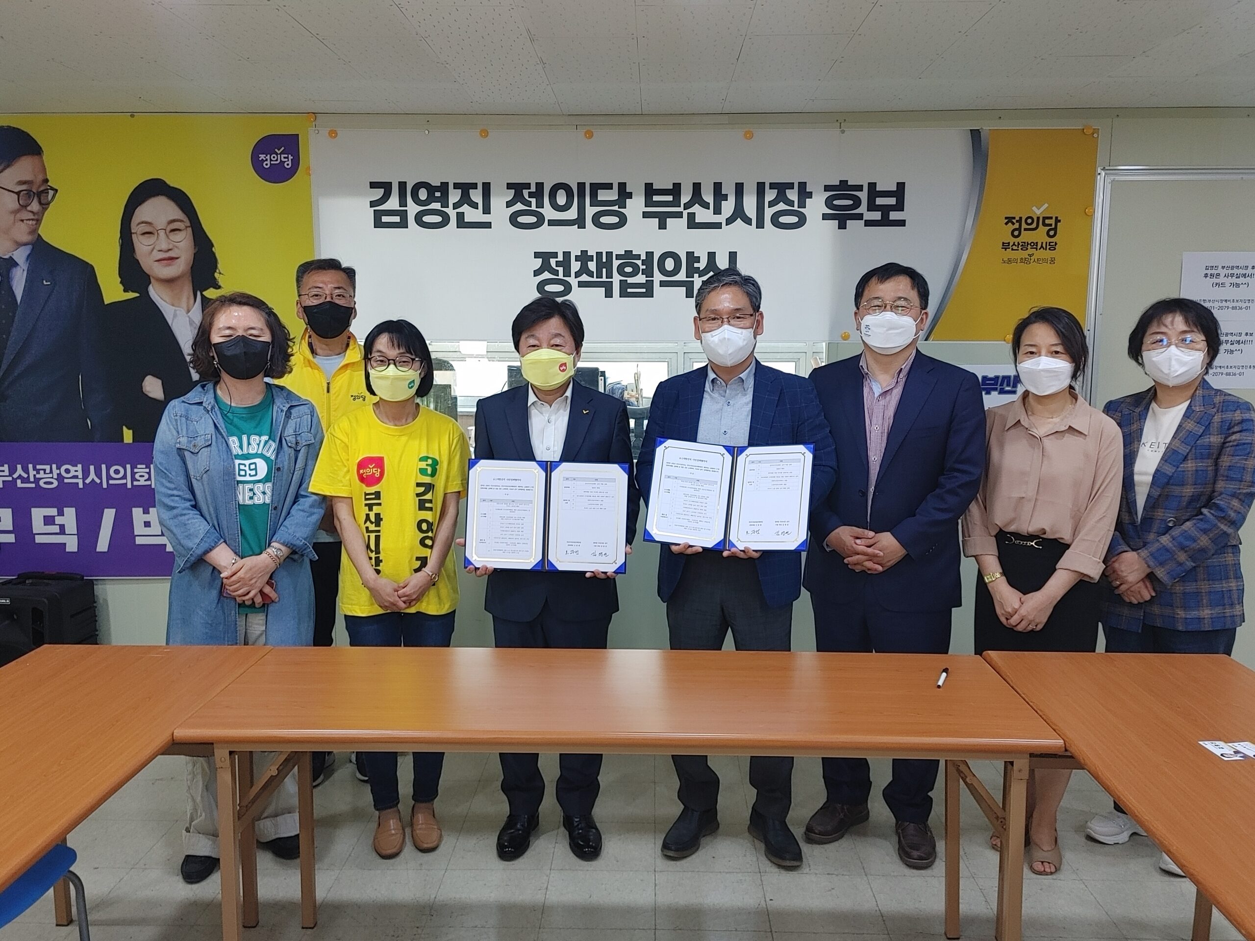 5월 25일 현재 더불어민주당 변성완 부산시장 후보, 정의당 김영진 부산시장 후보가 정책 협약식을 갖고,