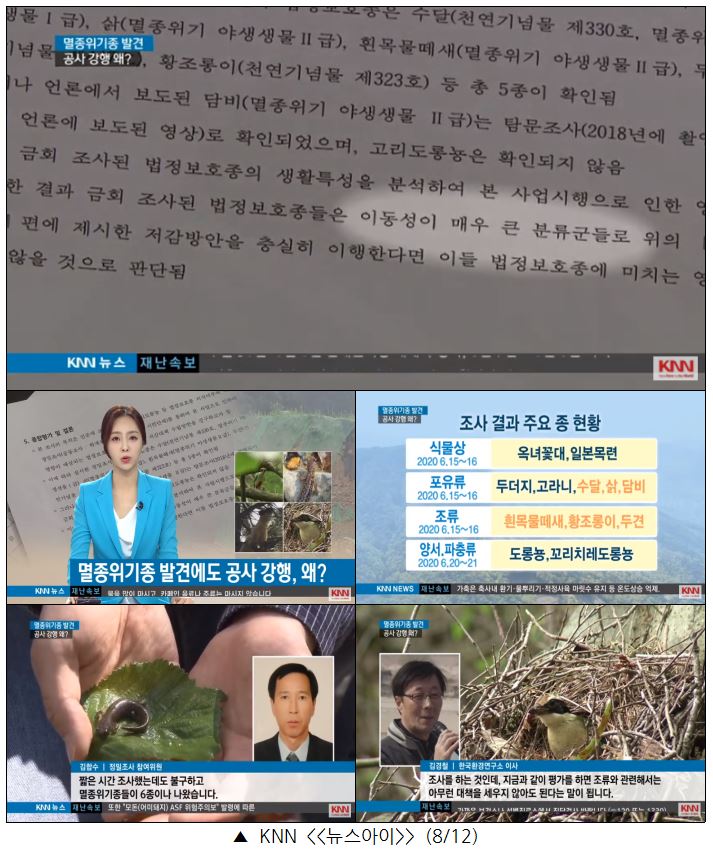 KNN은 12일 <멸종위기종 발견에도 공사 강행, 왜?>에서 양산 사송신도시 조성 공사가 희귀생물 보호에 대한 제대로 된 조치 없이 재개됐다고 고발했습니다. 지난 5월 KNN은 사송신도시 예정지에서 담비 등 멸종위기 동·식물 6종을 찾아낸 바 있습니다. 이 사실이 보도되자 LH는 환경단체와 면밀한 환경조사를 하기로 약속하고 공사를 중단했는데요, 이후 환경 보전에 대한 고려가 이루어지는지를 추적한 겁니다.
