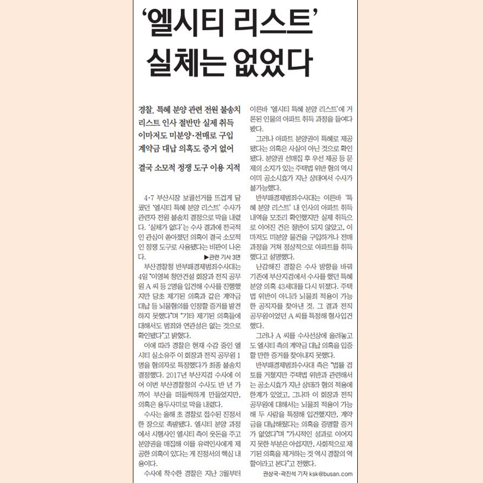4·7부산시장 보궐선거 기간에 불거진 ‘엘시티 특혜 분양 리스트’ 의혹은 당시 후보였던 박형준 시장의 엘시티 매입 과정에 대한 문제 제기와도 이어졌던 터라, 후보 검증의 측면에서도 지역 토착 비리 청산 측면에서도 분명한 지역의 주요 현안이었고 시민의 관심도 높았다. 지역언론 또한 경찰의 이번 수사 결과 발표를 주요하게 전달했다.