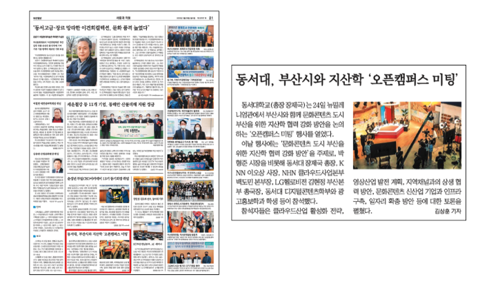 지역언론 보도에서 동서대학교 관련 기사를 살펴봤다. 지난달 24일 동서대학교에서 ‘오픈캠퍼스’ 행사가 열렸고, 이 소식을 국제신문, 부산일보, KNN이 보도했다. 특히 부산일보는 뉴스타파 보도 이후인 27일자 21면 하단에 24일에 발생한 소식을 배치하기도 했다.