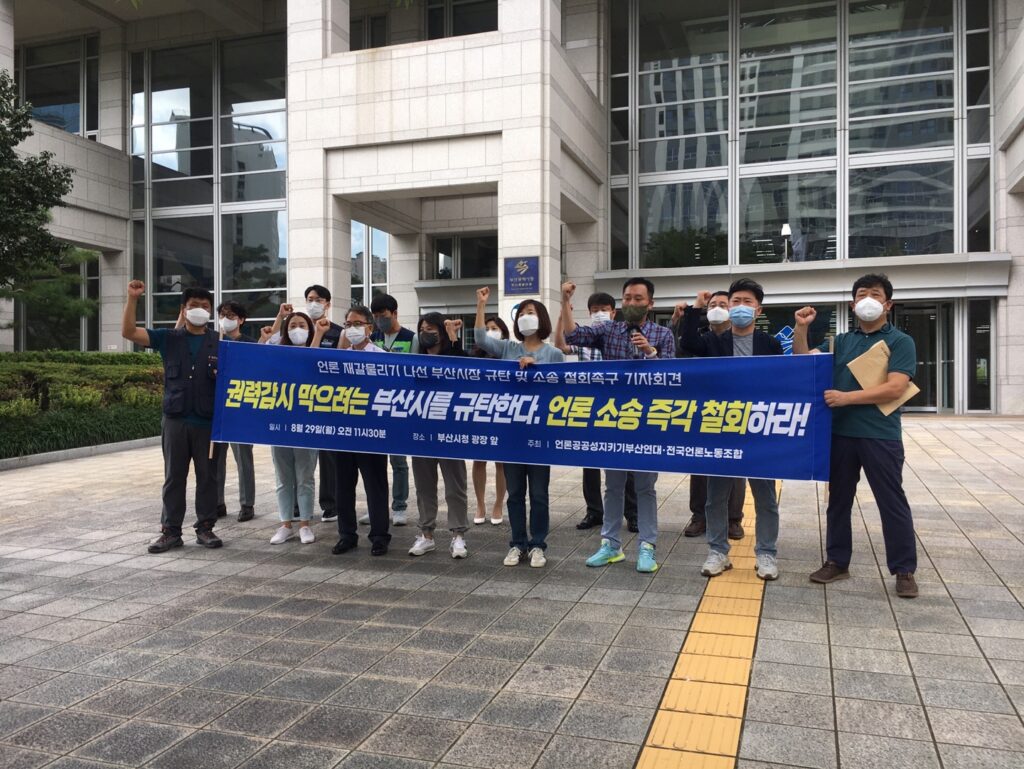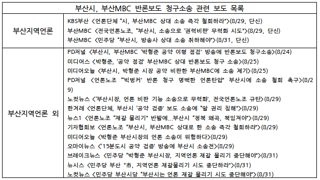 이같은 사실이 알려지면서 한국PD연합회 부산지부는 8월 24일 <정당한 비판을 틀어막으려는 부산시를 규탄한다>는 성명을 통해 ‘시장의 핵심 공약이자 적어도 수천억원의 혈세가 투입될 정책에 대한 비판을 원천 차단의 대상으로 바라보는 부산시의 태도가 우려스럽다’고 밝혔다. 이어 전국언론노동조합과 언론공공성지키기부산연대도 8월 29일 <언론 재갈물리기 나선 부산시장 규탄 및 소송 철회 촉구> 기자회견을 열고 부산시가 언론을 상대로 소송을 제기한 것에 대해 권력 감시, 시정 감시를 막고 시청자의 알권리를 침해하는 심각한 문제라 지적했다. 더불어민주당 부산시당도 8월 31일 성명을 내고 ‘지역언론의 정당한 방송보도에 대한 법적 소송을 즉각 취하하라’고 부산시에 촉구했다. 선거 기간 후보를 검증한 보도를 상대로 한 부산시의 반론보도 청구소송에 대해 언론노조와 언론시민단체, 지역정당은 성명, 기자회견을 통해 비판 입장을 밝혔다. 하지만 지역언론은 이를 지역민에게 전달하지 않았다. 8월 29일 기자회견 관련 단신 2건, 31일 민주당 성명 관련 단신 1건이 전부였다.