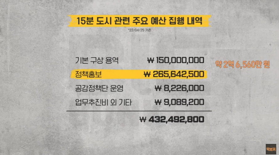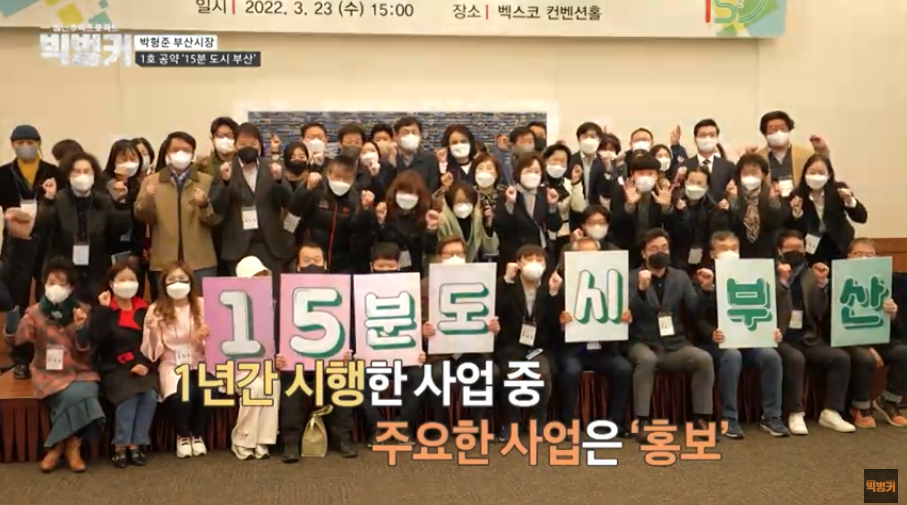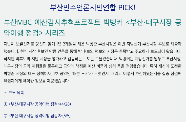 그런가운데 부산MBC <예산추적프로젝트 빅벙커>는 4월 28일과 5월 5일 두 차례에 걸쳐 ‘부산·대구시장 공약 이행 점검’ 편을 방송했다. 지방선거기획 5부작의 마지막 편으로 부산·대구시장 공약 이행 예산 62조 3,334억 원을 점검했다. 박형준 부산시장 1호 공약인 ‘15분 도시 부산’에 대한 집중 점검이 이뤄졌다. ‘15분 도시 부산’ 예산 집행 내역 중 정책홍보 예산 집행이 약 2억 6,560만 원으로, 지난 1년간 ‘15분 도시 부산’ 사업의 주요 사업은 ‘홍보’였다고 지적했다.