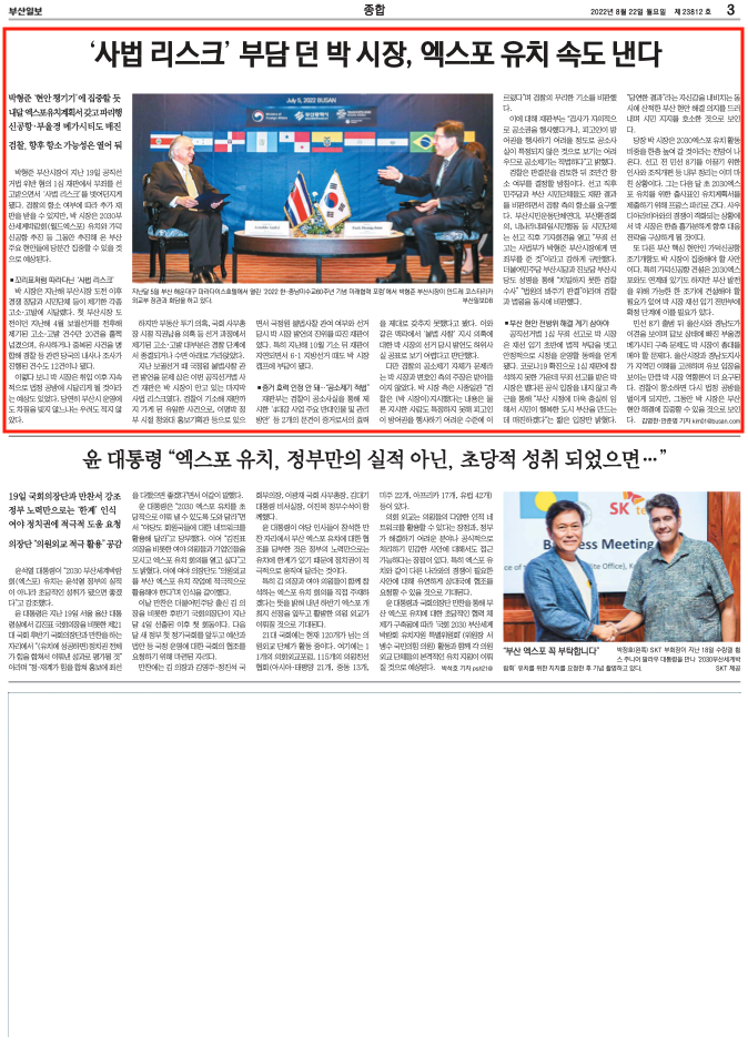 최근 부산지역언론, 특히 지역신문의 주요 이슈는 2030부산엑스포다. 8월 한 달만 놓고 봤을 때, 미군 55보급창 이전, 윤석열 대통령 취임 100일, 8·15광복절 특사, 박형준 시장 1심 무죄 선고와 같은 현안 모두 ‘2030엑스포’로 귀결되는 보도 경향을 보였다.