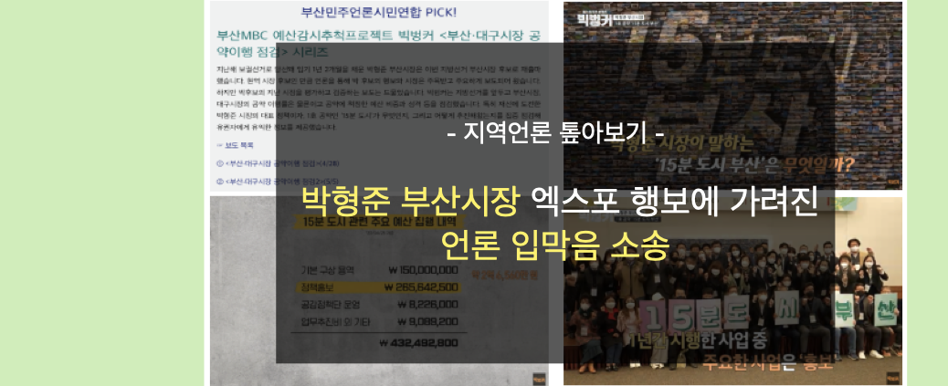 피해자인 부산시. 해당 보도자료에서 부산시는 선거기간 유권자를 대신해 후보와 공약을 검증한 언론 보도를 상대로 스스로를 피해자라 지칭했다. 권력에 대한 언론의 감시를 ‘잘못’이라고 인지할 때에만 나올 수 있는 단어 선택이다. 민주주의 국가에서 언론의 권력 감시 역할은 핵심적이다. 특히 선거기간에는 유권자의 알권리 보장을 위해 후보와 공약을 검증할 것이 요구되어진다. 언론의 권력 감시와 비판에 대해, 부산시와 부산시장은 스스로 스스럼없이 ‘피해자’라 지칭함으로써 부족한 공적 인식 수준을 드러냈다. 지난 보궐선거당시 2021미디어감시연대는 박형준 부산시장의 이명박 정부 당시 청와대 홍보비서관 경력에 대해 “언론에 재갈을 물리고 언론 노동자와 시민을 탄압한 과거를 반성하”고 “나아가 지역언론을 지역 민주주의 실현을 위한 협력자이자 감시자로서 존중하고 적극 소통할”것을 촉구했지만, 우려는 현실이 된 셈이다.
