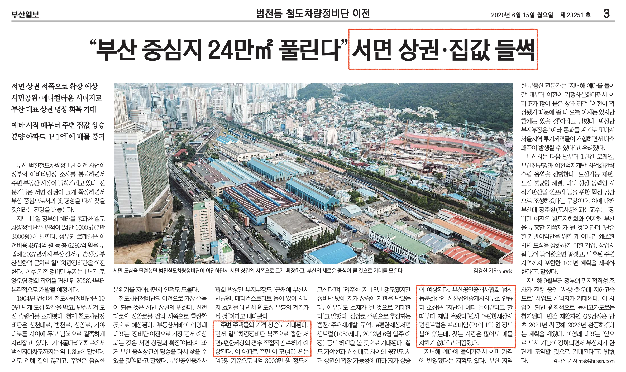 부산일보는 15일 <“부산 중심지 24만㎡ 풀린다” 서면 상권·집값 들썩>(3면)에서 ‘주변 부동산 시장이 들썩거리고 있’다 전했습니다. ‘범천철도차량정비단’ 이전 사업이 정부의 예비타당성 조사를 통과했다는 소식(6/12) 이후의 첫 후속 기사였는데요. 해당 기사에는 총 7명의 인터뷰이가 등장하는데 이중 4명이 부동산 전문가였고 이들은 원도심 일대의 부동산 가치를 긍정적으로 평가했습니다. 특히 기사는 범천동 일대의 아파트 중 특정 브랜드 아파트 이름을 세 차례 등장시키며, 인터뷰이의 입을 통해 해당 아파트가 이번 재개발의 직접적인 수혜자라 전했습니다.