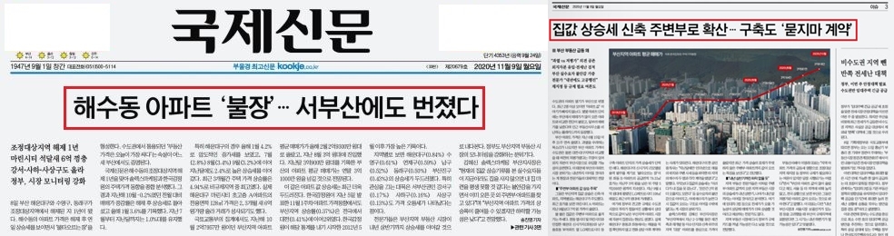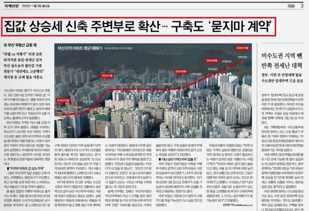 3면 <집값 상승세 신축 주변부로 확산…구축도 ‘묻지마 계약’>(송진영 기자) 기사에선 부동산 급등에 대한 원인과 내년 상반기까지의 전망을 담았는데요. 해당 기사는 ‘부산 아파트 가격이…저평가 됐다는 주장’, ‘정부의 견고한 규제로 수도권 시장 투자가 힘들어진 상황’, ‘부산지역 아파트 시장에 자본이 집중되는 현상’이라며 부산지역 부동산 시장 상승의 주요 원인으로 외지인의 투자를 꼽았습니다.