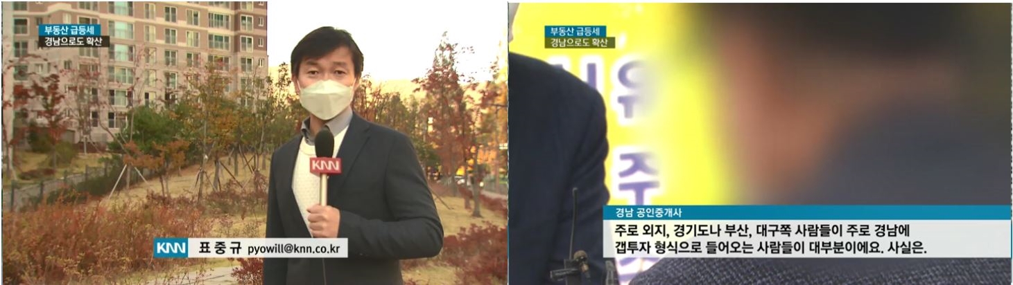 반면에,  KNN 뉴스아이의 <부동산 급등세 경남지역으로 확산>(11/10, 표중규 기자) 리포팅은 외지인 작전세력으로부터 실수요자들의 피해를 막는데 초점을 맞춘 보도였는데요. 해당 리포팅은 “20년 가까이 부동산 해왔지만 이런 예는 없었어요. 저도 처음이에요.”, “주로 외지, 경기도나 부산, 대구쪽 사람들이 주로 경남에 갭투자 형식으로 들어오는 사람들이 대부분이에요.”과 같은 부동산 공인중개사 인터뷰를 통해 지금 부동산 시장이 비정상적인 상황이라는 걸 전하는데 집중합니다.