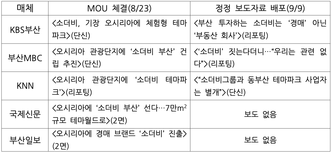 소더비 홍콩 법인의 내용 증명 이후, 지역언론의 보도를 살펴봤다. 눈에 띄는 특징은 ‘기사의 크기’와 ‘후속보도’ 유무였다. KBS부산과 부산MBC는 MOU체결 소식은 단신으로 전한 반면, 업무협약 내용 중 잘못된 사실이 있다는 게 밝혀진 이후에는 리포팅 기사로 전했다. KNN은 반대로 MOU업무협약은 리포팅으로, 사실을 바로 잡는 보도는 단신으로 했다. 국제신문과 부산일보는 MOU업무협약 소식을 나란히 8월 24일 자 신문 2면에 배치했지만, 이후 변경된 사안과 관련해선 보도하지 않았다.