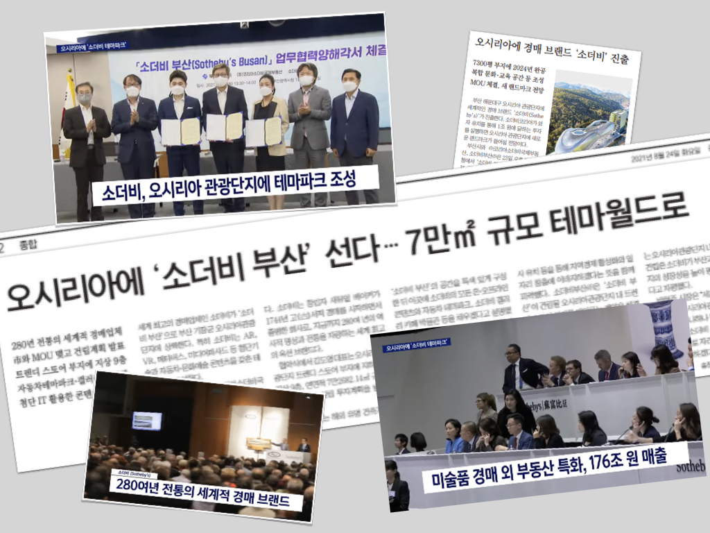 지난달 23일, 부산시는 (주)코리아소더비국제부동산, 소더비부산(주)과 ‘소더비부산’ 건립을 위한 업무협약 양해각서를 체결했다고 밝혔다. ‘소더비 부산’이 기장 오시리아관광단지에 테마파크를 조성하고 외자 유치 등으로 1조 원을 투자한다는 내용을 포함했다. 부산시는 세계적인 경매 회사인 소더비가 부산의 관광도시로서의 성장성을 높이 평가한 것이라는 점도 덧붙였다.