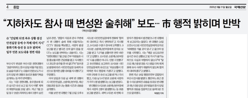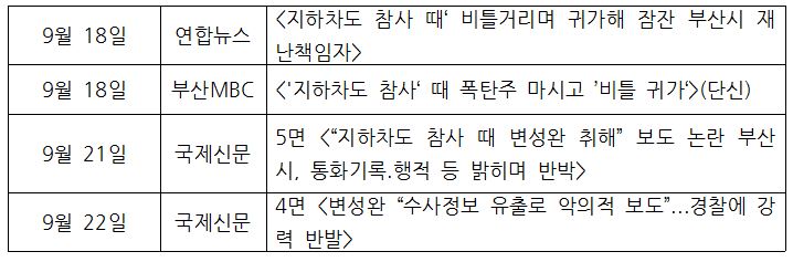 한편, 연합뉴스는 9월 18일 <‘지하차도 참사 때’ 비틀거리며 귀가해 잠잔 부산시 재난책임자>(김선호 기자) 에서 폭우 당시 변성완 권한대행의 부적절한 행보를 추가로 보도했습니다. 경찰 취재를 인용해 변 권한대행이 당시 외부 일정을 강행하고 술에 취한 채 비틀거리며 귀가했고 보고도 제대로 받지 않았다는 내용이었습니다. 경찰이 CCTV 화면을 확보했다고도 전했습니다.