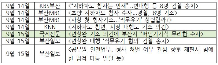 지역신문은 경찰의 수사 결과를 보도하면서도 부산시 입장에 무게를 실었는데요, 국제신문은 <변성완 기소 의견에 부산시 “떠넘기기식 무리한 수사”>(9/15, 박정민 이승륜 기자)에서 기사 본문에 등장하지 않는 ‘떠넘기기식’이라는 표현을 제목으로 달며 무리한 기소임을 부각했습니다.