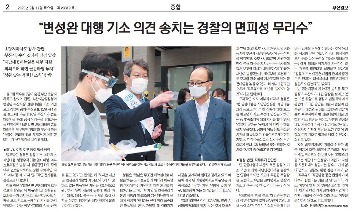 부산일보는 <공무원 안전업무, 형사 처벌 여부 관심 향후 재판서 첨예한 법적 다툼 벌일 듯>(9/15, 김백상 기자)에서 공직사회의 반응을 주요하게 전달했습니다. ‘큰 충격을 받았다’, ‘납득이 잘 안된다’라는 서술과 함께 경찰의 기소 의견을 ‘무더기’라 칭했습니다. 또 17일 부산일보는 <“변성완 대행 기소 의견 송치는 경찰의 면피성 무리수”>(9/17, 최세헌 권상국 기자)를 통해 변성완 권한대행의 법률 대리인 청률의 공식 입장문을 전달했습니다. 해당 기사와 함께 게재된 사진은 변 권한대행이 택시 방역소를 찾아 지시를 하고 있는 모습을 담고 있어 눈에 띄었습니다.