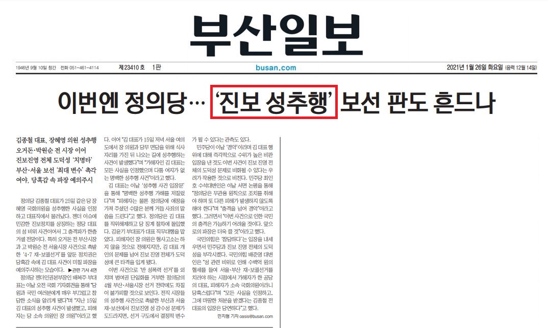 1월 26일 자 부산일보는 ‘김종철 정의당 전 대표 성추행’ 사건을 1면 머리기사, 정치면(4면) 머리기사로 올렸고 사설에서도 언급해, 이날의 가장 주요한 이슈로 다뤘는데요. 기사의 제목은 <이번엔 정의당…‘진보 성추행’ 보선 판도 흔드나>(1면)와 <‘진보 성추행’에…목청 키우는 ‘국힘’ 자세 낮추는 ‘민주’>(4면) 로, ‘진보 성추행’이라는 표현이 공통으로 등장했습니다.