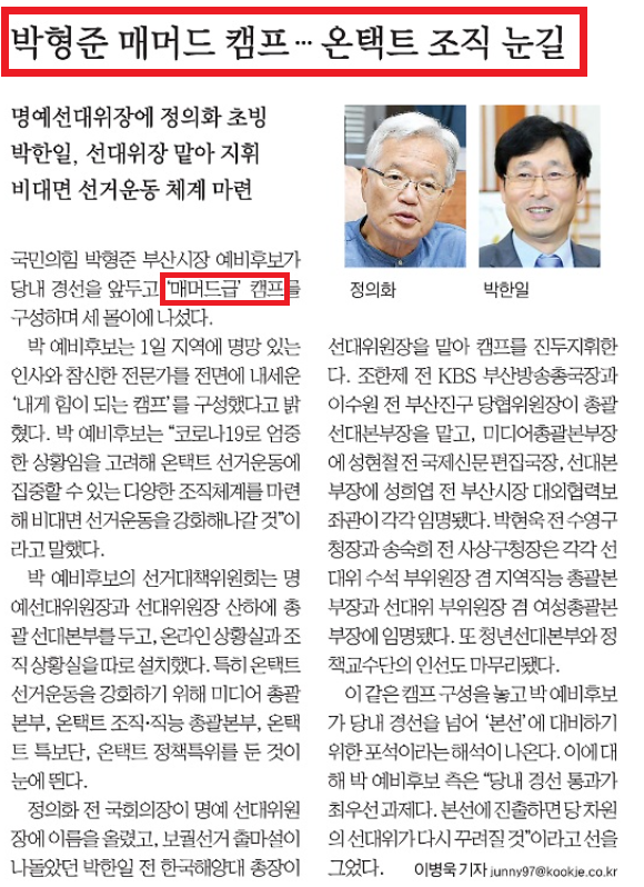 두 기사 모두 박형준 후보 선거 캠프를 ‘용광로 캠프’, ‘매머드급 캠프’라 별칭을 붙이고 캠프 구성원을 자세히 소개하여, 특정 후보 캠프 세 과시에 힘을 실어주는 모습이었습니다.