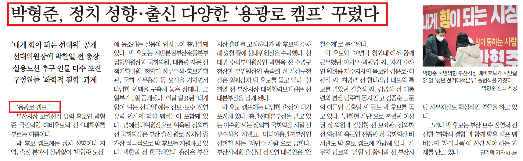 2월 2일자 부산일보는 4면(4.7 부산시장 보궐선거 기획면)에 국민의힘 박형준 후보의 캠프 소식을 전했습니다. <박형준, 정치 성향·출신 다양한 ‘용광로 캠프’ 꾸렸다>(권기택 기자)에서 ‘박형준 노선’에 동조하는 실용파 ‘거물급’ 인사들이 대거 포진해 있음을 전하고, 그 인사들의 면면을 소개했습니다. 같은 날 국제신문도 박형준 후보 캠프 구성에 대한 기사를 게재했습니다. 5면(4.7 부산시장 보궐선거 기획면) <박형준 매머드 캠프 ··· 온택트 조직 눈길>(이병욱 기자)에서 ‘온택트 선거운동’강화위한 각종 체계를 소개했습니다. 또한 부산 지역의 명망있는 인사와 참신한 전문가로 캠프를 구성한 것에 대해 ‘매머드급 캠프’라며 선거 ‘본선’에 대비하기 위한 준비라는 해석을 내놓기도 했습니다.
