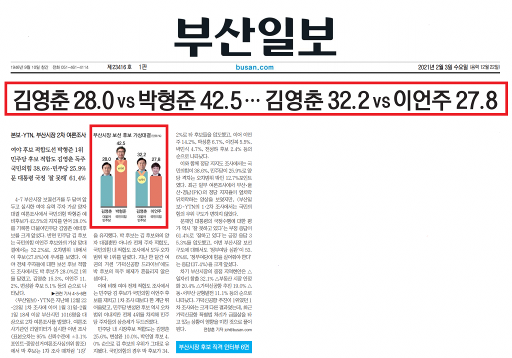 1면에 여야 유력 주자 가상 양자대결 결과 <김영춘 28.0 vs 박형준 42.5…김영춘 32.2 vs 이언주 27.8>(전창훈 기자)를 게재했습니다. 국민의힘 박형준 예비후보가 42.5%로 더불어민주당 김영춘 예비후보(28.0%)를 크게 앞섰고, 국민의힘 이언주 후보와 김영춘 후보 가상 맞대결에서는 김영춘 후보가 32.2%로 이언주 후보(27.8%)보다 오차범위 내 우세를 보였다고 밝혔습니다. 박형준 후보는 양자대결뿐만 아니라 전체 주자 적합도, 국민의힘 내 적합도에서도 모두 오차범위 밖 1위로 나타나 “여권의 ‘가덕신공항 드라이브’에도 박후보 독주체제가 흔들리지 않은 셈”이라고 보도했습니다.