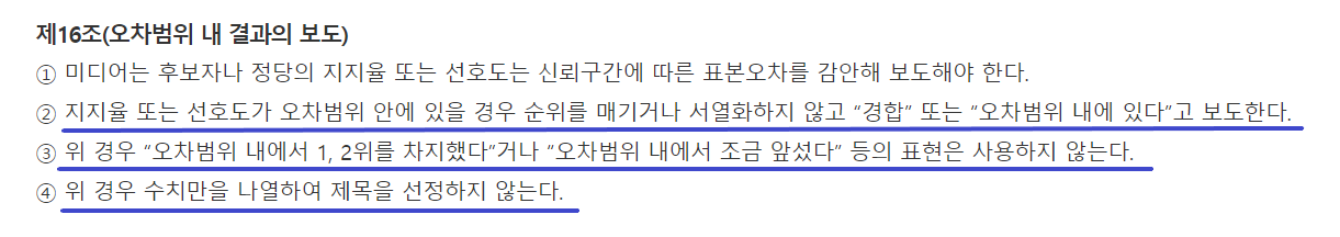 특히 김영춘 후보(32.2%)와 이언주 후보(27.8%) 가상대결 결과는 오차범위 내 격차인 4.4%였음에도 불구하고 그래픽에서 김영춘 후보에 ‘WIN’으로 표시했습니다. 결과적으로 국민의힘은 박형준 후보가 본선 대결에 나서야지만 보궐선거에서 승리할 수 있다는 메시지를 시각적으로 강조하고 있는 셈이었습니다. 이는 한국기자협회의 <선거여론조사보도준칙> 제16조(오차범위 내 결과의 보도)의 아래의 조항을 모두 어긴 보도이기도 합니다.
