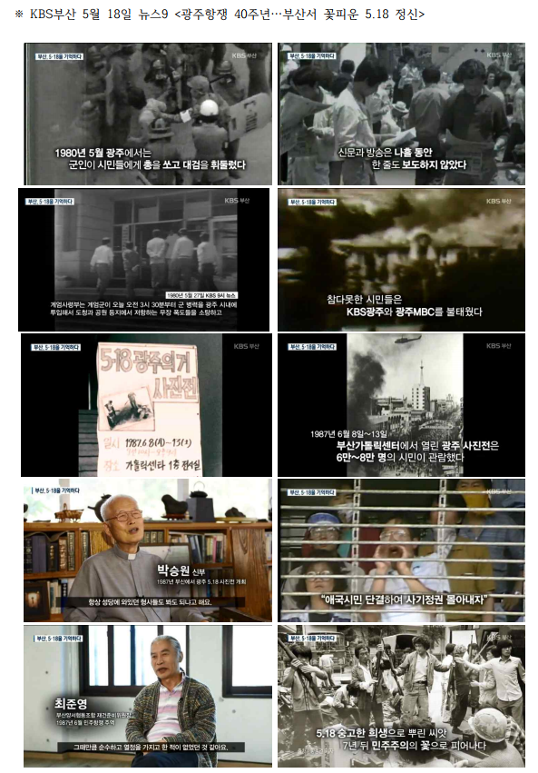 5‧18민주화운동 관련 지역 언론 보도 중에서는 KBS부산이 눈에 띄었습니다. 뉴스9에서 <광주항쟁 40주년…부산서 꽃피운 5.18 정신>을 보도했는데요, 뉴스에서는 드물게 한 꼭지가 6분이 넘는 분량이었습니다. 80년 광주 현장과 당시 KBS를 비롯한 언론의 왜곡보도를 짚었고, 이어 광주의 비극을 알리려 노력한 부산의 이들을 영웅이라며 소개했습니다. 부산지역 기자 최초로 현장을 취재한 김양우 전 국제신문 기자, 부산에서 광주의 진실을 알리는 사진전을 개최한 박승원 신부와 거리에서 유인물을 배포한 노재열 당시 학생 등입니다. 5‧18 광주 이후 부산의 민주화 운동은 광주를 알리기 위해 노력했고 이후 87년 민주화운동으로 이어졌다고 보도했습니다. 기존 뉴스 리포트 틀을 벗어나 KBS가 보유한 미공개 현장 영상과 시민들의 인터뷰를 통해 광주와 부산이 연대로 이어졌음을 조명한 보도였습니다.