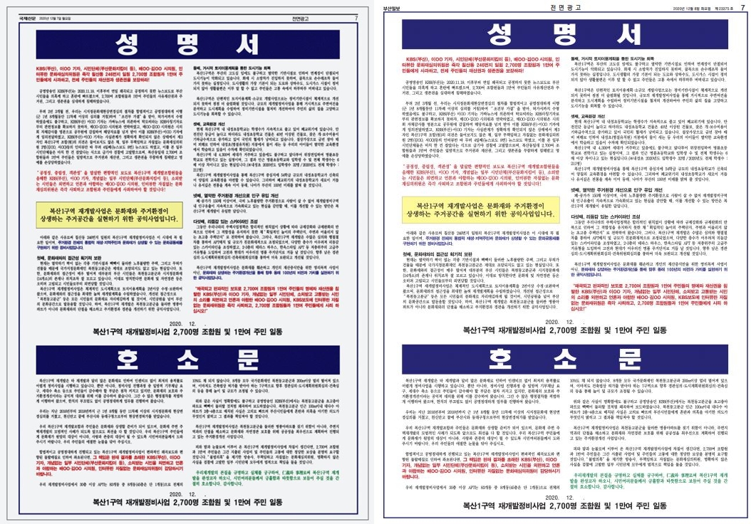 지역 일대 재개발 사안을 두고 벌어진 KBS부산과 재개발 조합원 간의 갈등 아닌 갈등. 이 갈등 국면에서 국제신문과 부산일보는 ‘전면광고’를 통해 경제적 이득만을 취했습니다. 기사가 아닌 광고도 ‘국제신문’, ‘부산일보’라는 신문사 이름 아래의 지면을 사용하기에 언론은 이에 대한 사회적 책임이 있고 무엇보다 언론도 이 의견광고의 주체로 인식케 됩니다.