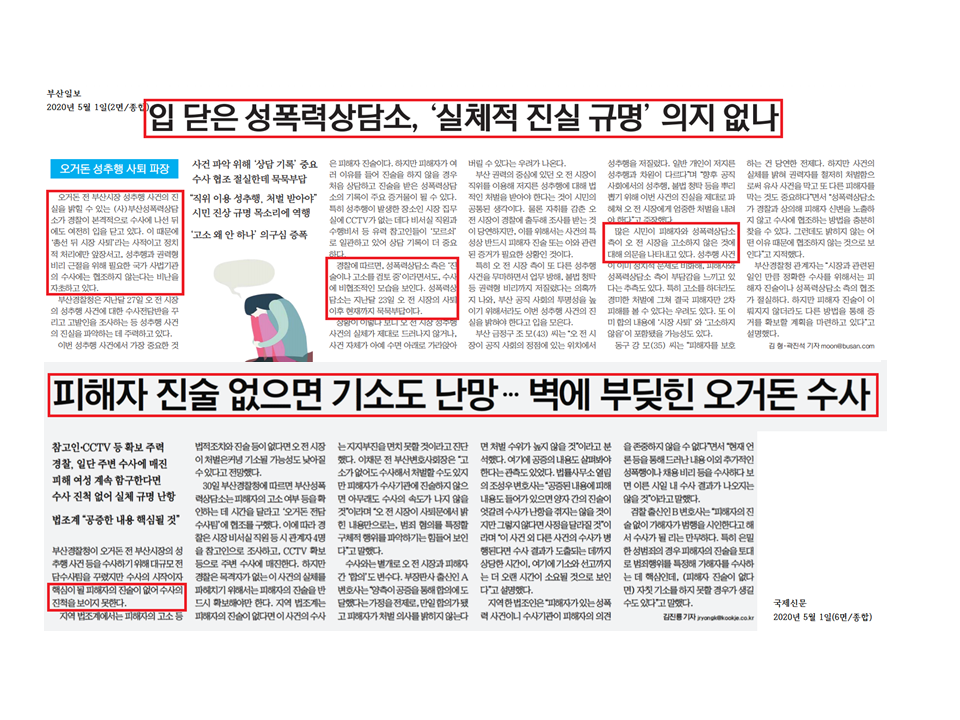 부산일보 <입 닫은 성폭력상담소, ‘실체적 진실 규명’ 의지 없나>(5/1, 2면)는 현직 시장을 상대로 공증까지 받아내며 가해자의 시장직 사퇴까지 이끌어낸 피해자 측을 ‘실체적 진실 규명’과 대립하는 관계로 드러내며, 되려 피해자 측이 ‘실체적 진실 규명’의 장애물인 것처럼 보도했다. 특히 기사는 “‘총선 뒤 시장 사퇴’라는 사적이고 정치적 처리에만 앞장서고, 성추행과 권력형 비리 근절을 위해 필요한 국가 사법기관의 수사에는 협조하지 않는다는 비난을 자초하고 있다”는 서술을 통해 피해자의 용기 있는 행동을 사적, 정치적 처리라 폄훼했다. 또한 비난을 자초하고 있다는 서술은 주어가 없이 등장해 누구로부터의 비난인지도 알 수 없었다. 이는 언론이 성폭력 사건 보도에서 주의해야 할 피해자에 대한 2차 가해를 한 모양새였다.