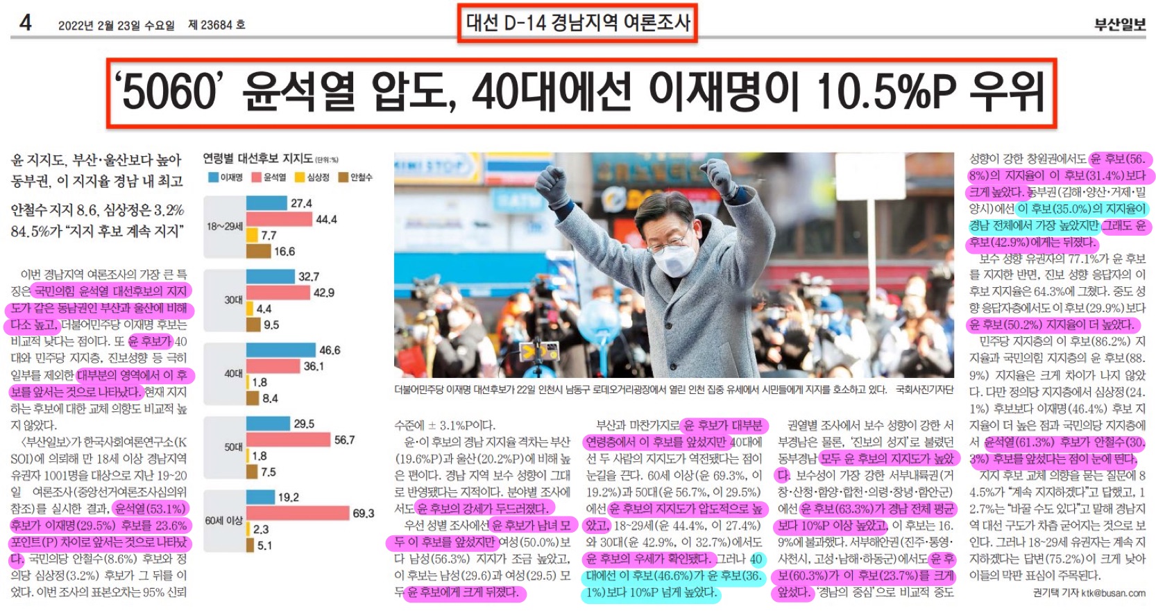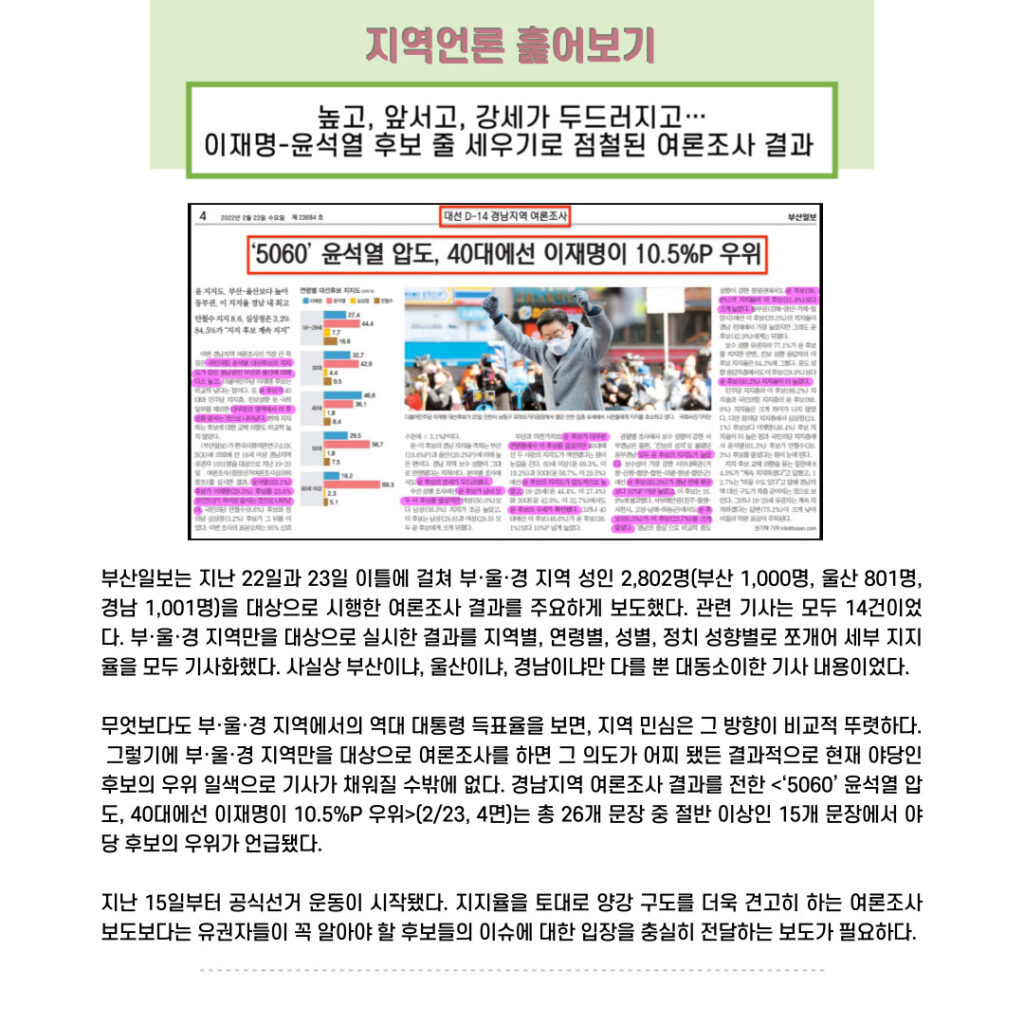 경남지역 여론조사 결과를 전한 <‘5060’ 윤석열 압도, 40대에선 이재명이 10.5%P 우위>(2/23, 4면)는 총 26개 문장 중 절반 이상인 15개 문장에서 야당 후보의 우위가 언급됐다.