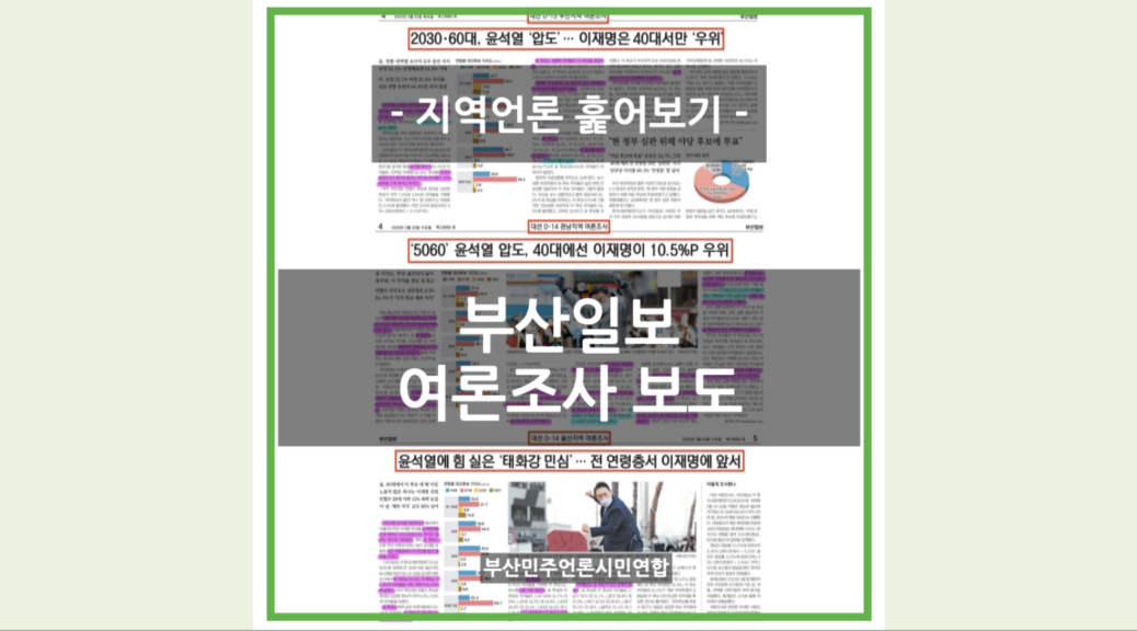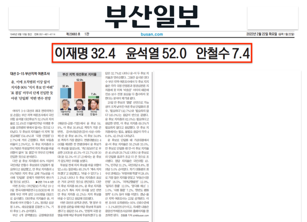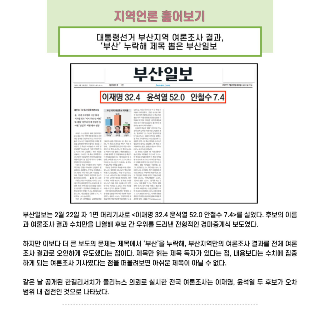 부산일보는 2월 22일 자 1면 머리기사로 <이재명 32.4 윤석열 52.0 안철수 7.4>를 실었다. 후보의 이름과 여론조사 결과 수치만을 나열해 후보 간 우위를 드러낸 전형적인 경마중계식 보도였다. 하지만 이보다 더 큰 보도의 문제는 제목에서 ‘부산’을 누락해, 부산지역만의 여론조사 결과를 전체 여론조사 결과로 오인하게 유도했다는 점이다. 제목만 읽는 제목 독자가 있다는 점, 내용보다는 수치에 집중하게 되는 여론조사 기사였다는 점을 떠올려보면 아쉬운 제목이 아닐 수 없다. 같은 날 공개된 한길리서치가 폴리뉴스 의뢰로 실시한 전국 여론조사는 이재명, 윤석열 두 후보가 오차범위 내 접전인 것으로 나타났다.